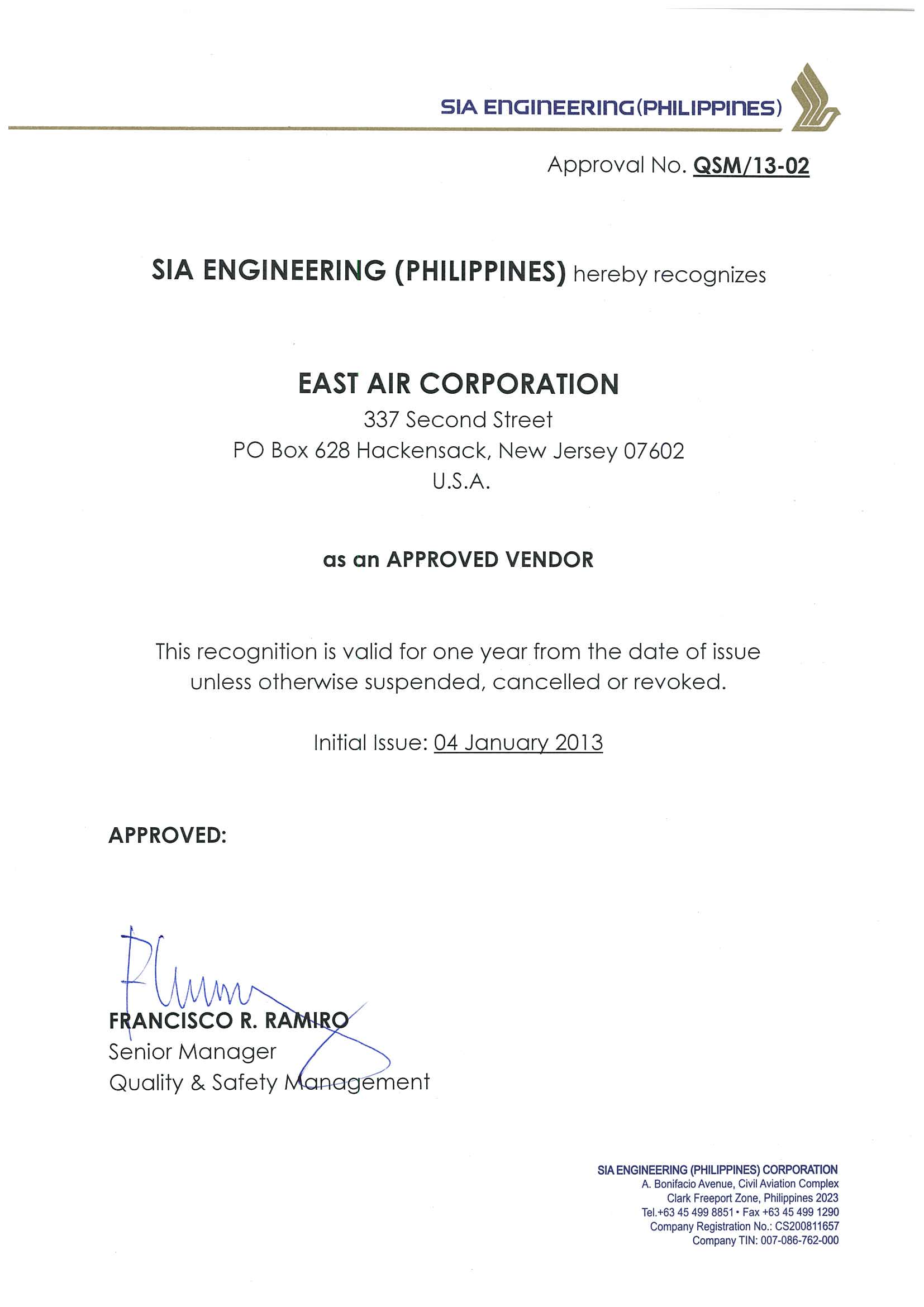 ContinueEast Air Corporations' latest approval: "After evaluation of the accomplished self-audit checklist and documentations submitted to us, we find East Air Corporation meets our requirements and is therefore will continue as an accredited part and materials supplier. Your company will be re-entered in our list of approved vendor. Please see attached Letter of Recognition. Renato F. Ramos Quality Manager SIA Engineering Philippines