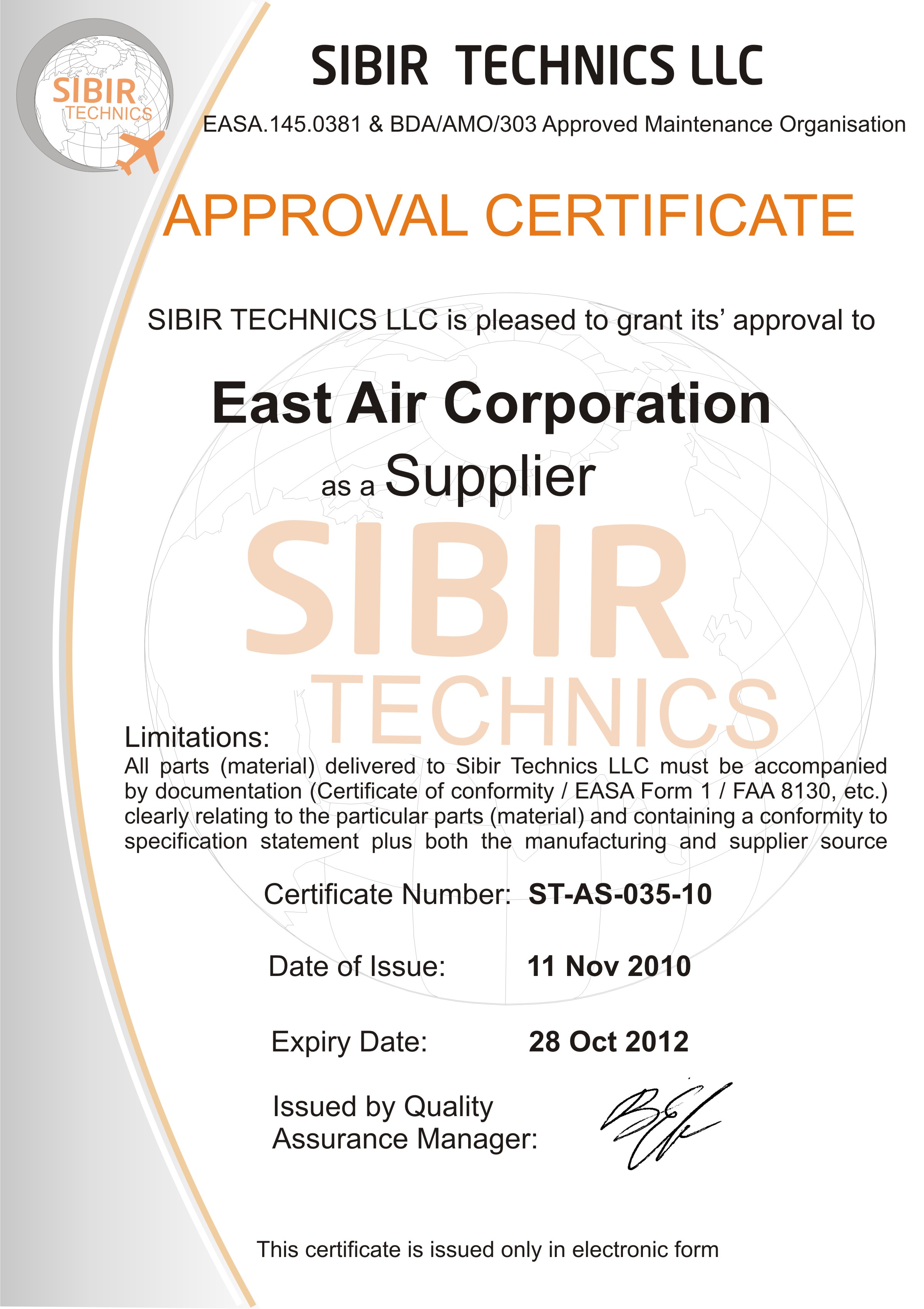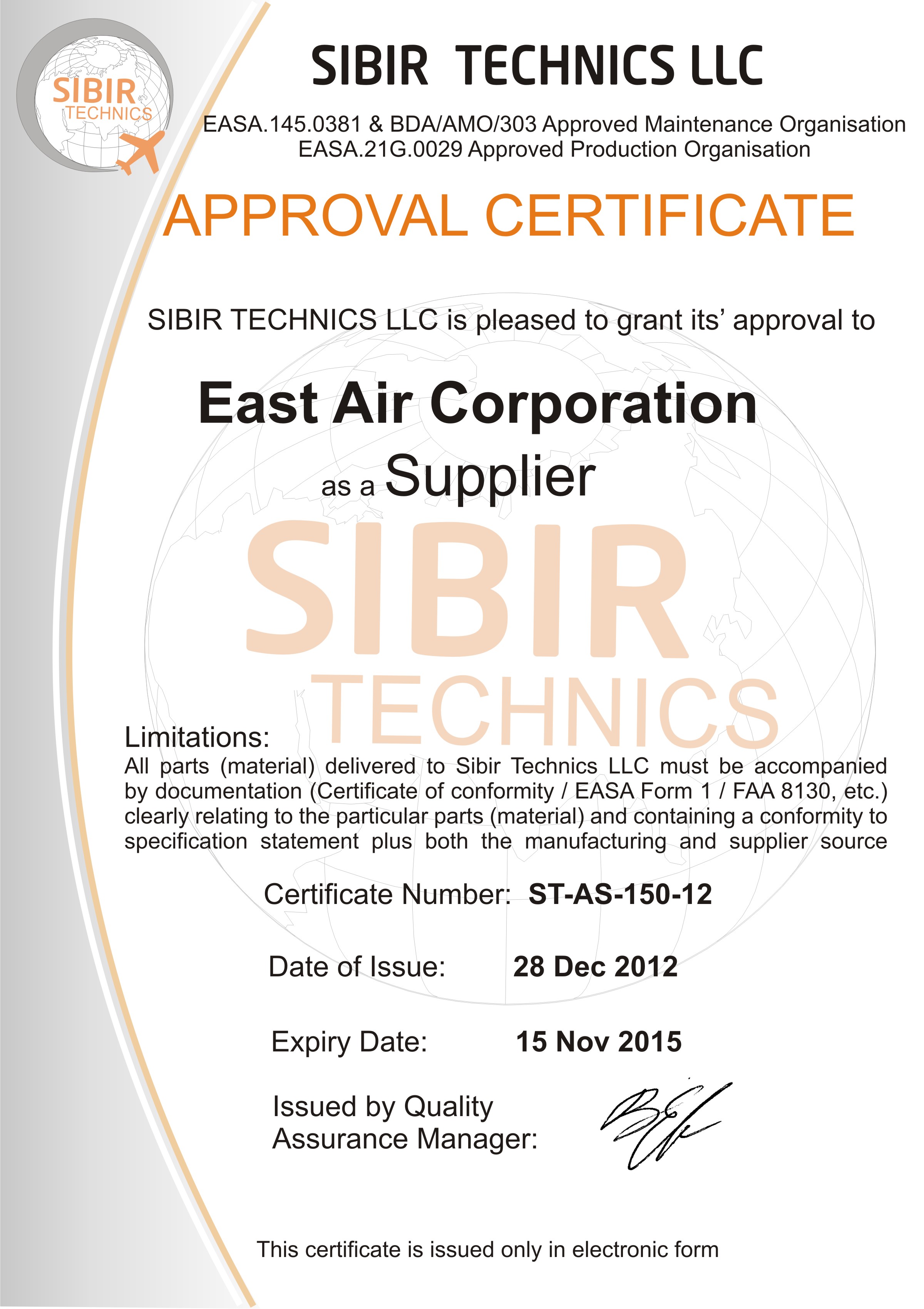ContinueSIBIR TECHNICS LLC grants its approval to East Air Corporation as a Supplier under Certificate Number ST-AS-150-12.
