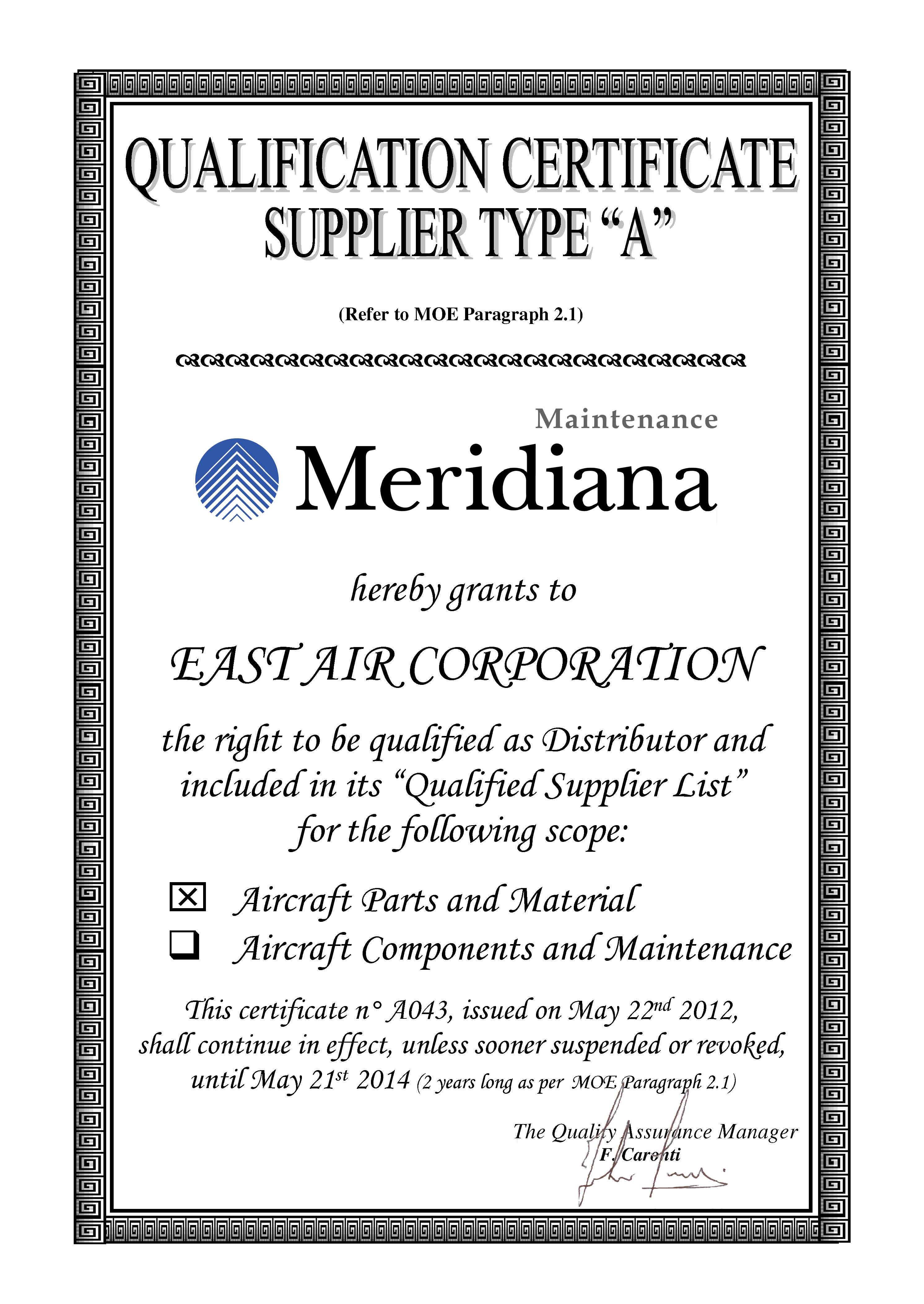 ContinueOn May 22, 2012 Meridiana Maintenance selected East Air Corporation to be qualified as Distributor and included in its "Qualified Supplier List" for the Aircraft Parts and Material. Certificate number: A043 Issued on May 22, 2012 Effective until May 21, 2014.