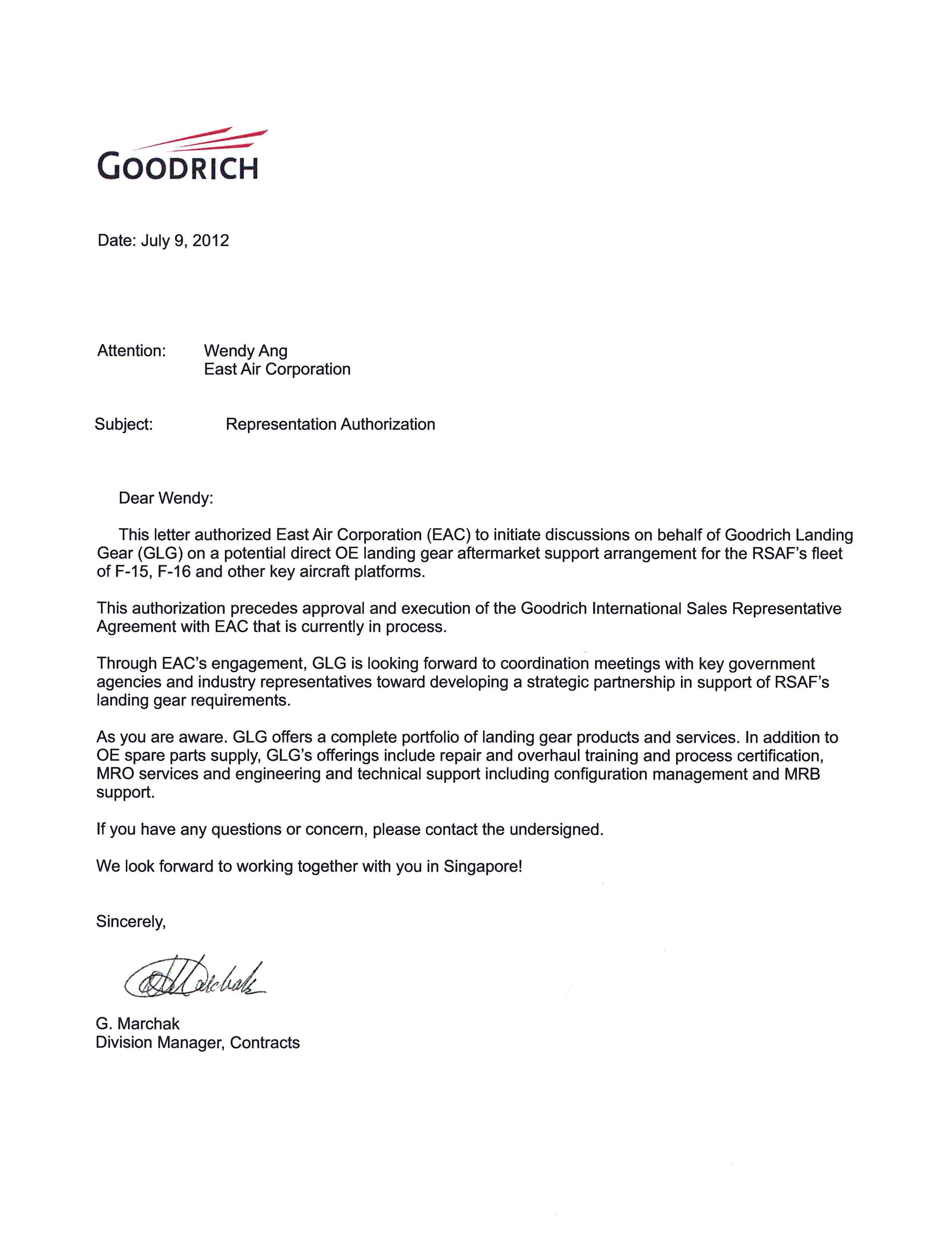 ContinueEast Air Corporation has been authorized by Goodrich Landing Gear (GLG) to initiate discussions on their behalf for landing gear aftermarket support for the RSAF's fleet of F-15, F-16 and other key aircraft platforms.