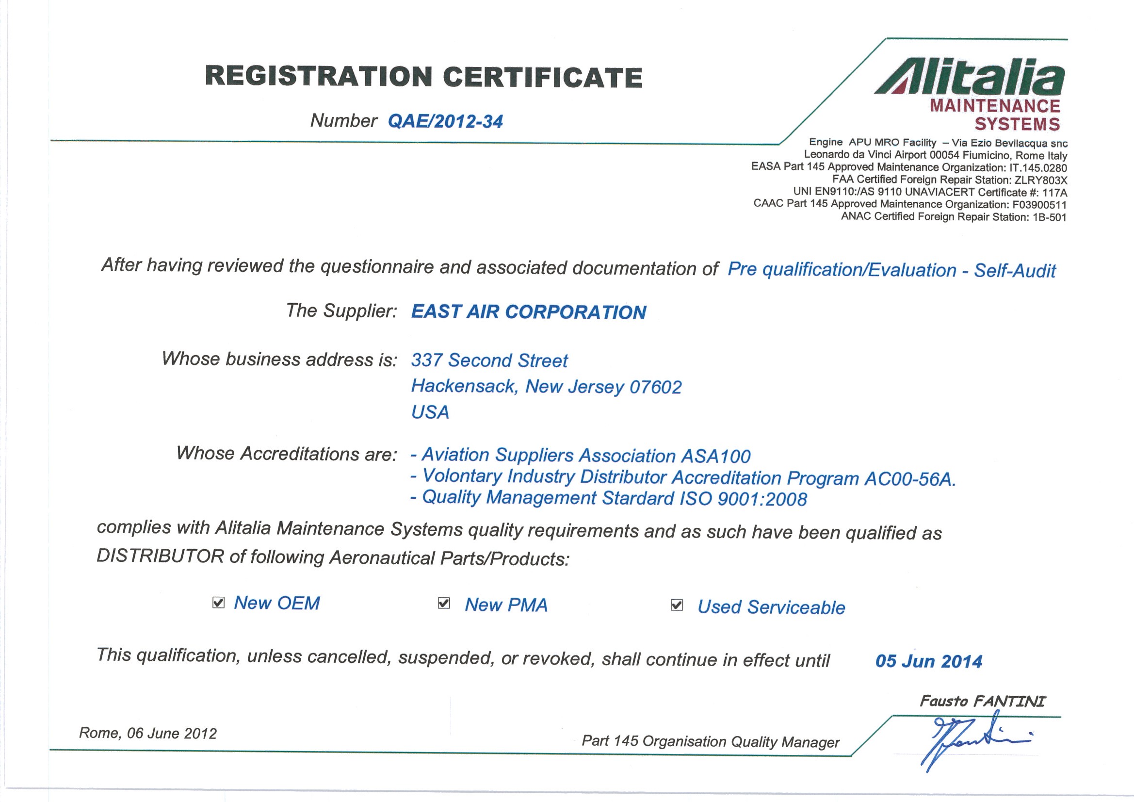 ContinueAs of June 6th, 2012, East Air Corporation has been qualified as a distributor of New OEM parts, New PMA parts and used serviceable aeronautical parts/products to Alitalia Maintenance Systems. Registration Certificate number: QAE/2012-34